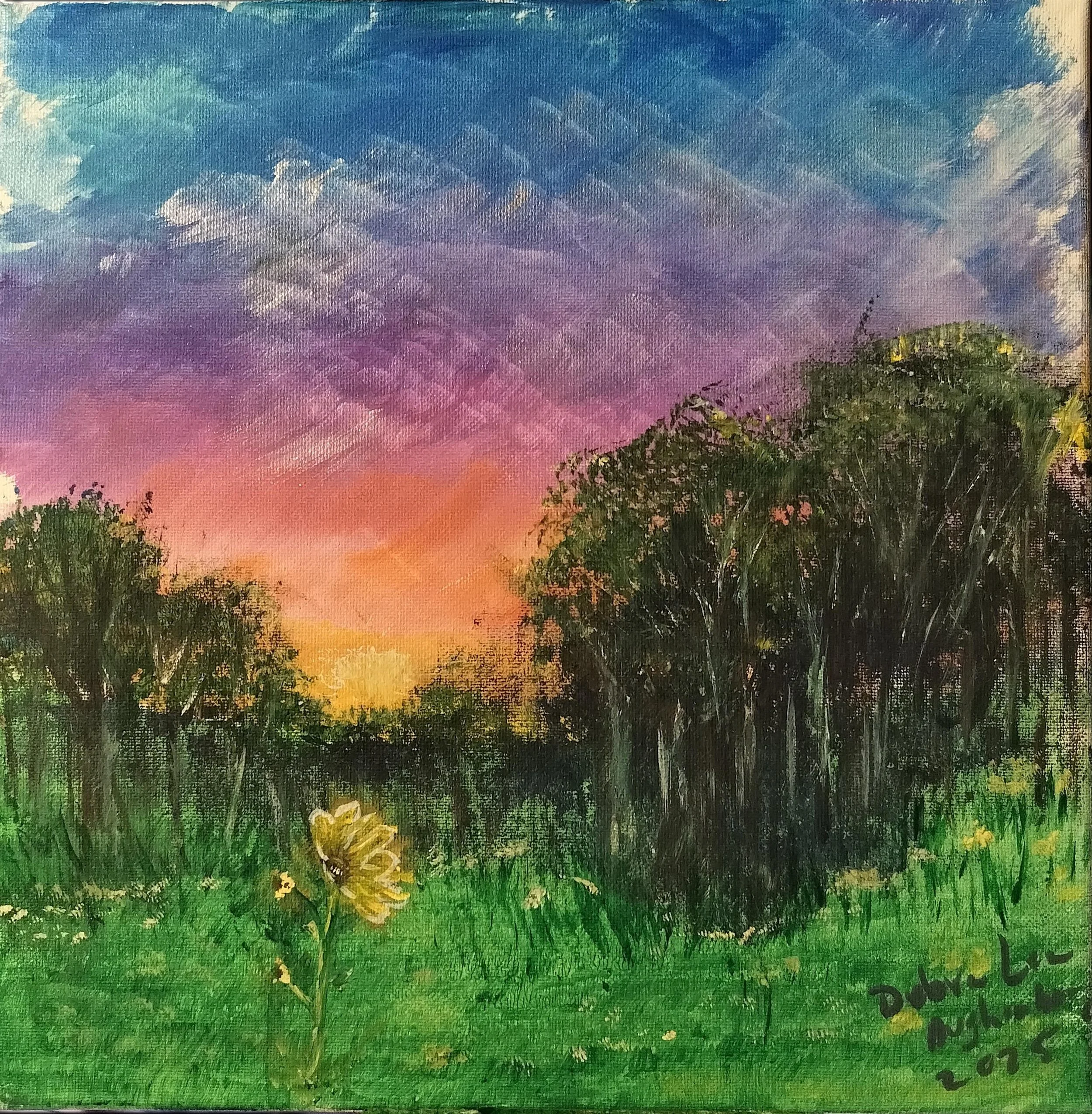 In this painting, a single sunflower rises from the meadow, holding its face toward the horizon where day and night meet in holy embrace. Behind it, the trees form a quiet cathedral, their shadows framing the brilliance of the sky. The heavens glow in shifting hues—indigo dissolving into violet, violet into rose, rose into a golden flame—as if the whole universe were whispering a benediction over the earth.